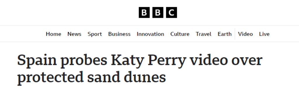 Katy Perry is under scrutiny from Spanish officials over allegations that her music video for the new single “Lifetimes” was filmed on ecologically sensitive sand dunes without proper authorization.