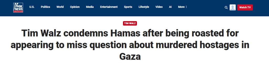 In the video, Walz is seen greeting supporters and answering a few questions. As he interacts with the crowd, someone off-camera asks, “What’s your reaction to the six hostages being found dead in Gaza?” However, instead of addressing the question, Walz is heard saying, “All right, thanks everybody,” before walking away.