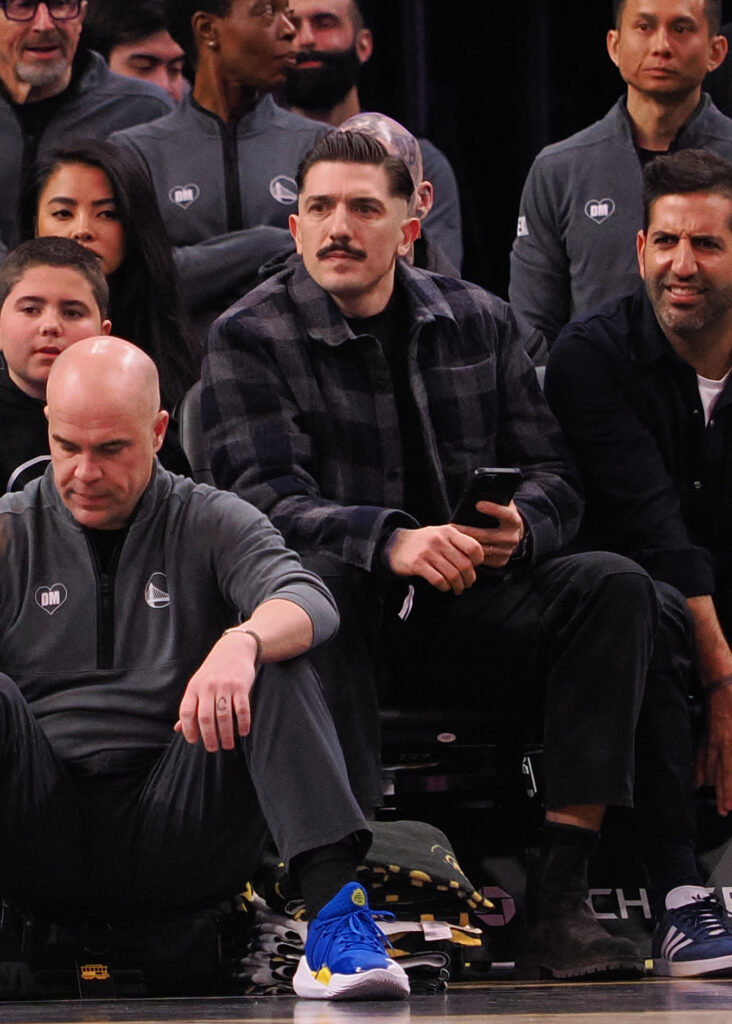 Mar 7, 2024; San Francisco, California, USA; Actor and comedian Andrew Schulz sits courtside during the third quarter between the Golden State Warriors and Chicago Bulls at Chase Center. Mandatory Credit: Kelley L Cox-USA TODAY Sports